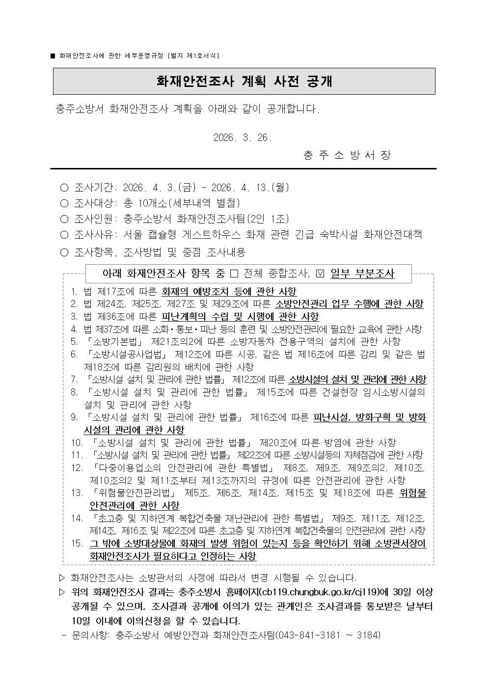 | 이전글 | 화재안전조사 계획 사전 공개(2026년 4월 정기 화재안전조사) |